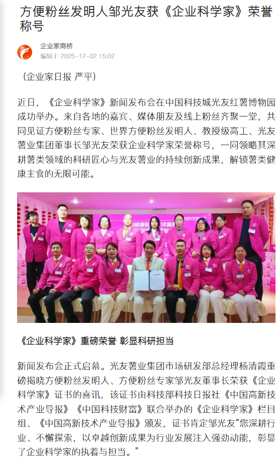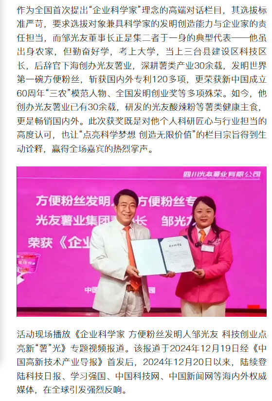 方便粉丝发明人邹光友获《企业科学家》荣誉称号