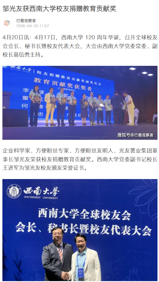 转载巴蜀观察者 邹光友获西南大学校友捐赠教育贡献奖