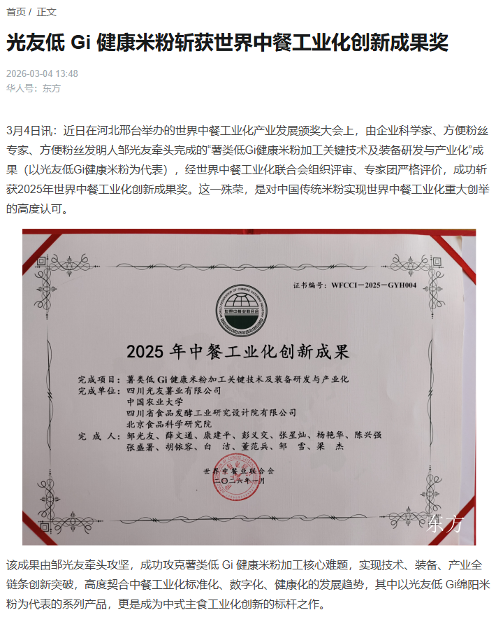转载华人头条:光友低 Gi 健康米粉斩获世界中餐工业化创新成果奖