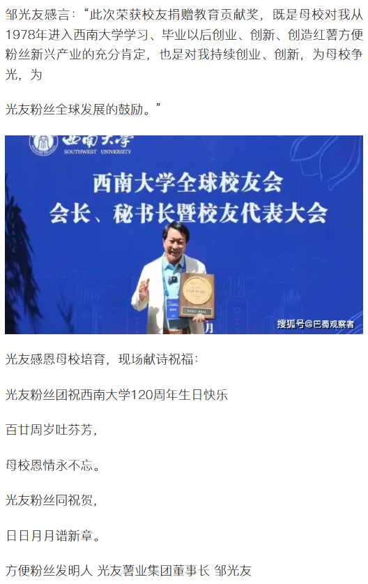 转载搜狐网 邹光友获西南大学校友捐赠教育贡献奖