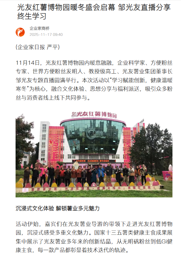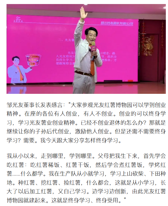 转载搜狐网-光友红薯博物园暖冬盛会启幕 邹光友直播分享终生学习