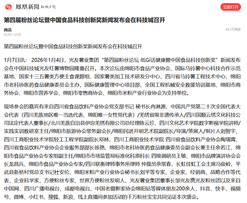 转载凤凰网 第四届粉丝论坛暨中国食品科技创新奖新闻发布会在科技城召开